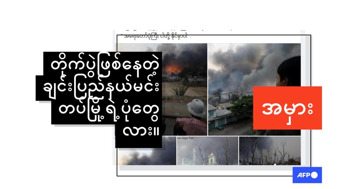 အောက်မှာ နားလည်မှုလွဲစေတဲ့ပို့စ်ပါဓာတ်ပုံ (ဘယ်) နဲ့ AFP ဓာတ်ပုံ (ညာ) တို့ကို နှိုင်းယှဉ်ပြထားတဲ့ screenshot ဖြစ်ပါတယ်။