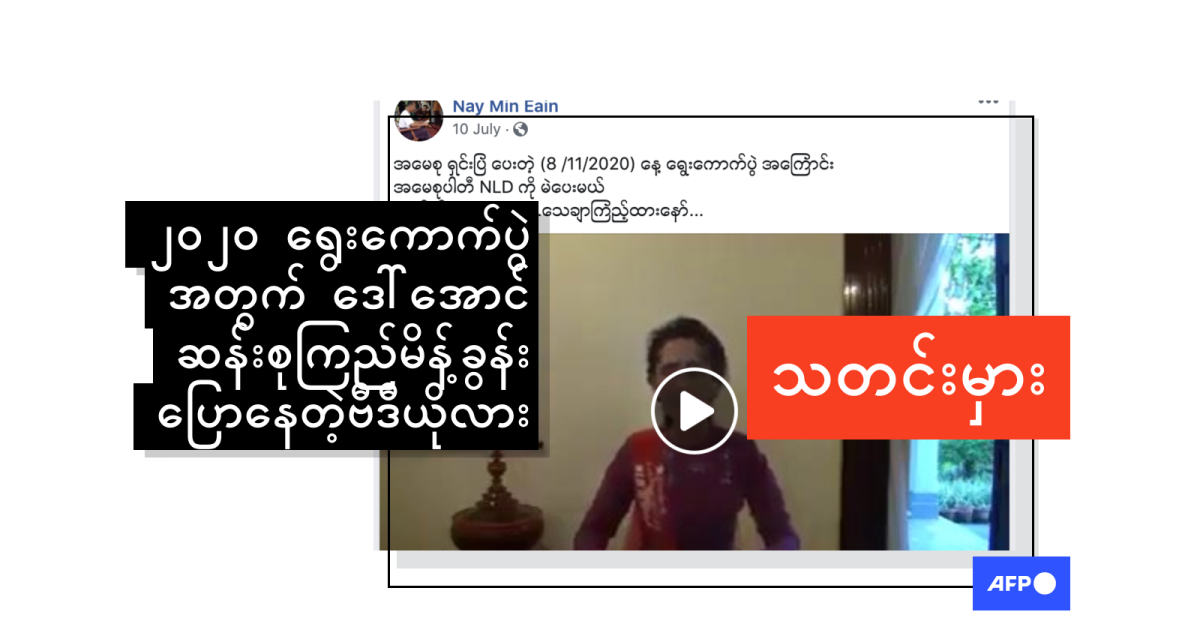 မြန်မာနိုင်ငံရဲ့ နောက်လာမယ့် အထွေထွေရွေးကောက်ပွဲကို ၂၀၂၀ ခုနှစ်၊ နိုဝင်ဘာလ ၈ ရက်နေ့မှာ ကျင်းပမှာ ဖြစ်ပါတယ်။ ဒီမဲပေးပွဲဟာ ဒေါ်အောင်ဆန်းစုကြည်ဦးဆောင်တဲ့ အရှိန်ယူစဒီမိုကရေစီအစိုးရအတွက် စမ်းသပ်မှုတစ်ခုလို့ လူတော်တော်များများက ယူဆကြပါတယ်။ လာမယ့် ရွေးကောက်ပွဲနဲ့ပတ်သက်လို့ AFP ရဲ့ သတင်းကို ဒီလင့်ခ်မှာ ဖတ်နိုင်ပါတယ်။