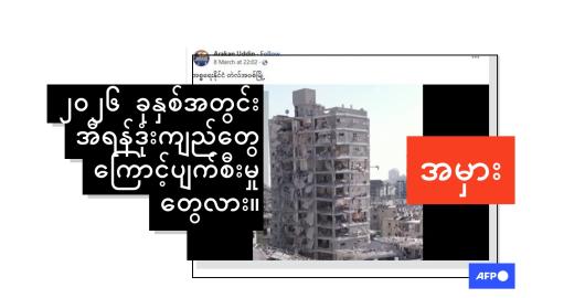 ပုံရိပ် မြန်မာနိုင်ငံ မငြိမ်မသက်မှု ပုံနှိပ်ဖော်ပြသည့်နေ့စွဲ 17/03/2026 ငလျင်ကြောင့်ပျက်စီးခဲ့တဲ့ မြသိန်းတန်စေတီဓာတ်ပုံတွေကို စစ်တပ်ဗုံးကြဲမှုဆိုပြီး မှားယွင်းမျှဝေ