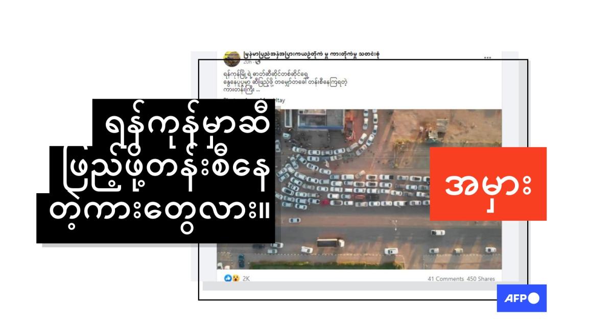 ဓာတ်ပုံနဲ့အတူ “ရန်ကုန်မြို့ရဲ့ ဓာတ်ဆီဆိုင်တစ်ဆိုင်ရှေ့ နွေနေပူပူမှာ ဆီဖြည့်ဖို့ တမျှော်တခေါ် တန်းစီနေကြရတဲ့ ကားတန်းကြီး ... Photo Aung Myo Htay” (မူရင်းအတိုင်း) ဆိုတဲ့ စာသားကို ဖော်ပြထားပါတယ်။