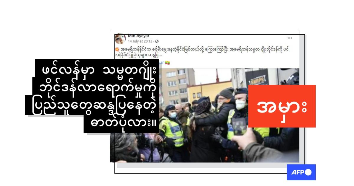 “အမေရိကန်နိုင်ငံက စစ်မီးမွှေးနေတဲ့နိုင်ငံဖြစ်တယ်လို့ ကြွေးကြော်ပြီး အမေရိကန်သမ္မတ ဂျိုးဘိုင်ဒန်ကို ဖင်လန်နိုင်ငံပြည်သူများ ဆန္ဒပြ” (မူရင်းအတိုင်း) ဆိုပြီး ဓာတ်ပုံနဲ့အတူစာသားဖော်ပြထားပါတယ်။