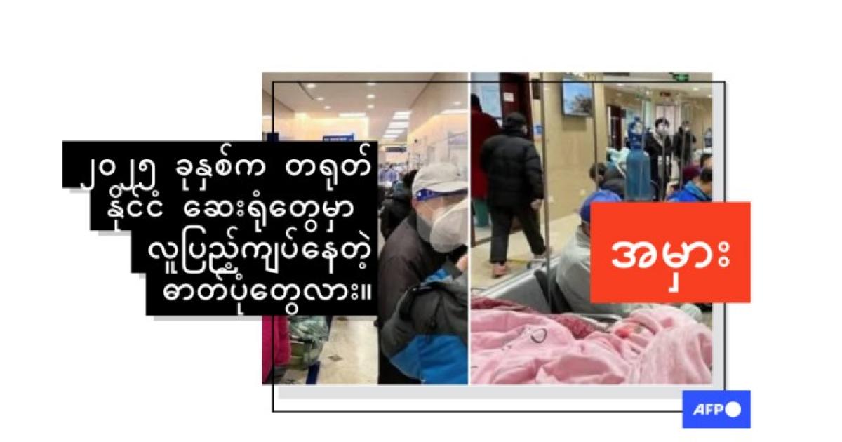 "၂၀၂၃ ခုနှစ်၊ ဇန်နဝါရီလ ၁၇ ရက်တွင် ရှန်ဟိုင်းမြို့တွင်း ကိုဗစ်ရောဂါကူးစက်မှုမြင့်တက်နေချိန် ဆေးရုံတစ်ရုံ၏အရေးပေါ်ကုသရေးဌာနရှိ လူနာတင်တွန်းလှည်းပေါ်တွင် လူနာတစ်ဦးလဲလျောင်းအိပ်စက်" ဆိုပြီး ဓာတ်ပုံအညွန်းစာပါရှိပါတယ်။