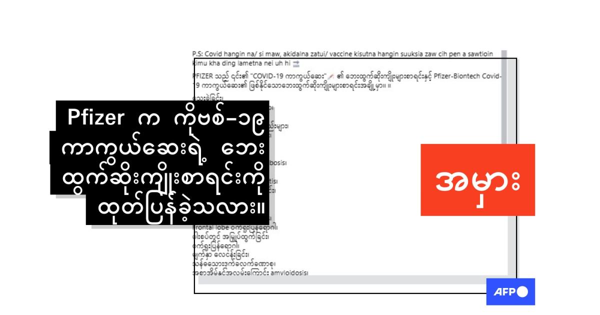 "ကာကွယ်ဆေးရဲ့ သိရှိထားပြီဖြစ်တဲ့ အကျိုးထိရောက်မှုနဲ့ အန္တရာယ်ကင်းမှုပုံရိပ်ကို ထင်ဟပ်မှုမရှိတဲ့ ဒီစာရင်းကို Pfizer က မထုတ်ပြန်ခဲ့ပါဘူး။" လို့ ကုမ္ပဏီရဲ့ပြောရေးဆိုခွင့်ရှိသူတစ်ဦးက AFP ကို ပြောပါတယ်။