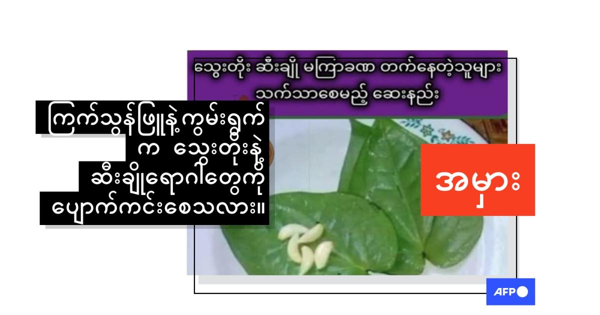 "ကြက်သွန်ဖြူက သွေးဖိအားကို အနည်းငယ်ကျဆင်းနိုင်ချေရှိပေမဲ့ သွေးတိုးရောဂါကို ကုသလို့တော့မရပါဘူး။ ကွမ်းရွက်ကလည်း သွေးတိုးနဲ့ ဆီးချိုကို ကုသနိုင်တယ်ဆိုတဲ့ သက်သေပြချက်မရှိပါဘူး" ဆိုပြီး ဟောင်ကောင်တက္ကလိုလ်၊ ပြည်သူ့ကျန်းမာရေးဆိုင်ရာ ဆေးပညာဌာနရဲ့ ကထိကတစ်ဦးဖြစ်သူ ဒေါက်တာ ဖြူဖြူသင်းဇော်က ၂၀၂၅ ခုနှစ်၊ သြဂုတ်လ ၂၁ ရက်မှာ အီးမေးလ်ကတဆင့် AFP ကိုပြောပါတယ်။ (Archived link)