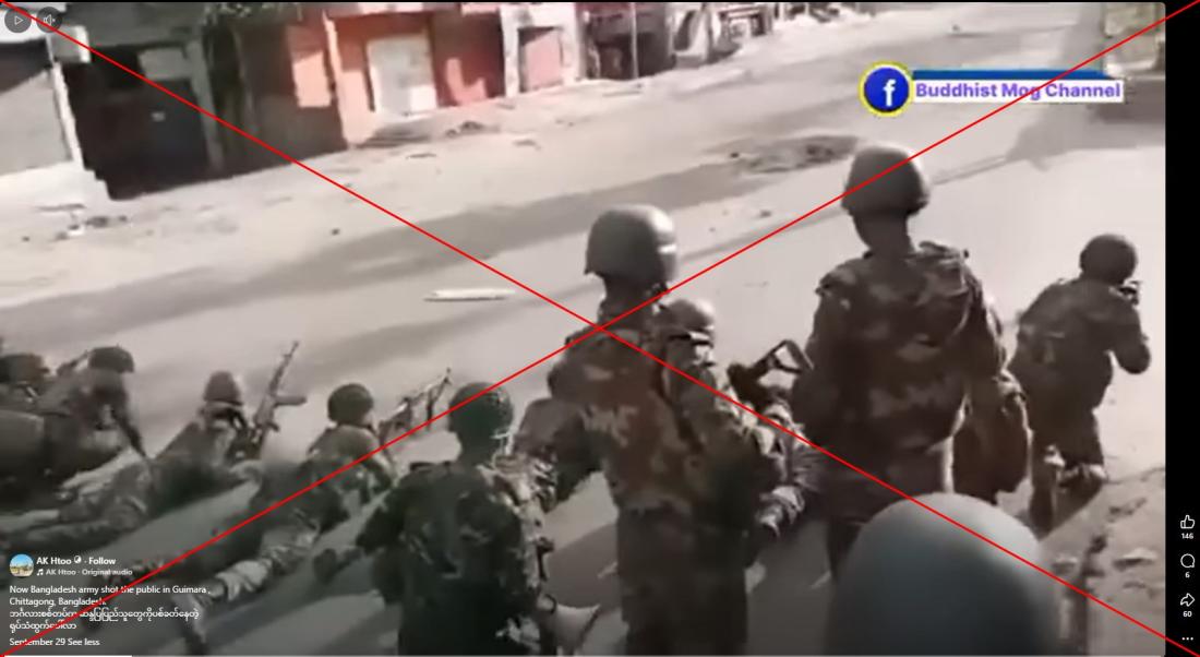 "ဘင်္ဂလားစစ်တပ်က ဆန္ဒပြပြည်သူတွေကိုပစ်ခတ်နေတဲ့ရုပ်သံထွက်ပေါ်လာ" (မူရင်းအတိုင်း) ဆိုပြီး စက်တင်ဘာလ ၂၉ ရက်က မျှဝေထားတဲ့ Facebook ပို့စ်မှာရေးသားထားပါတယ်။