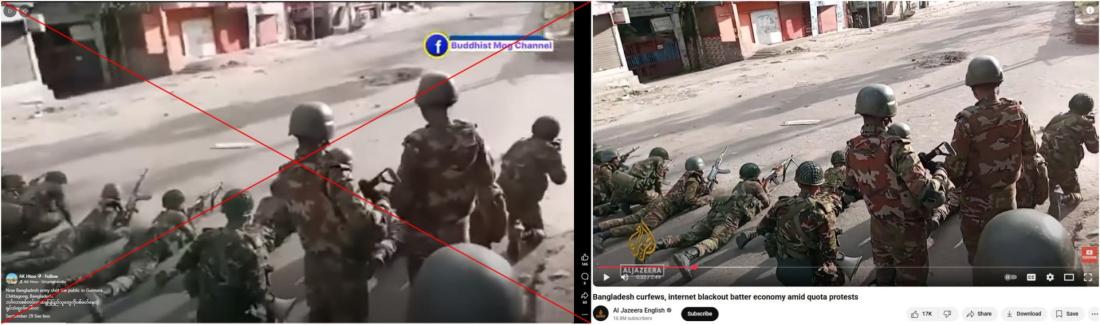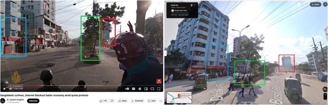 Alamy ရဲ့ဓာတ်ပုံနဲ့ Al Jazeera ရဲ့ ဗီဒီယိုမှာပါတဲ့ ဆိုင်ခန်းတွေနဲ့ အဆောက်အအုံတွေဟာ Google Street View မှာတွေ့ရတဲ့ ဒါကာမြို့ရဲ့ လူနေရပ်ကွက်နဲ့ ကိုက်ညီမှုရှိပါတယ်။ ဒါကာမြို့ဟာ Khagrachari နဲ့ ၁၈၀ ကီလိုမီတာ (၁၁၂ မိုင်) အကွာမှာတည်ရှိပါတယ်။ (Archived link)