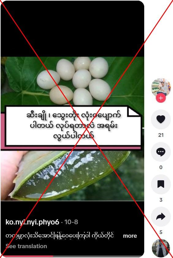 "လူလေး အမေရောဂါ ဆီးချို ၊ သွေးတိုး တို့ကိုဗမာတောကြက်ဥ ရှားဇောင်းလက်ပတ်တို့ကလက်တွေ့ကျကျသက်သာပျောက်ကင်းသွားပါပြီ" (မူရင်းအတိုင်း) ဆိုပြီး ၂၀၂၅ ခုနှစ်၊ အောက်တိုဘာလ ၈ ရက်က မျှဝေထားတဲ့ ဒီ TikTok ဗီဒီယိုမှာ တစိတ်တပိုင်းရေးသားထားပါတယ်။