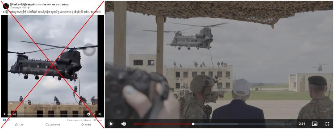 မှားယွင်းပို့စ်တွေမှာတွေ့ရတဲ့ စစ်ရေးလုပ်ဆောင်ချက်တွေကို ကြည့်ရှု့လေ့လာနေတဲ့ ဦးထုပ်အဖြူရောင်ဝတ်ဆင်ထားတဲ့ ထရမ့်ကို ဗီဒီယိုရဲ့ ၁ မိနစ် ၃၁ စက္ကန့်ကြာချိန်မှာ တွေ့နိုင်ပါတယ်။