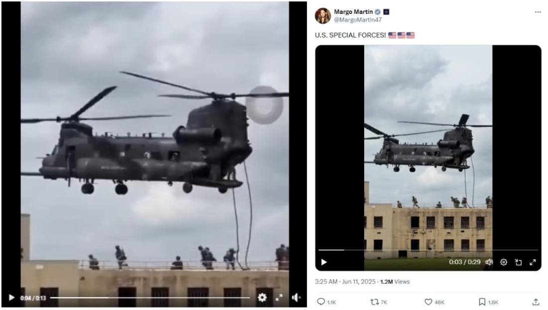 ဗီဒီယိုထဲကရုပ်ပုံတွေကိုအသုံးပြုပြီး ဓာတ်ပုံရာဇဝင်ရှာဖွေမှုအပြင် အဓိကကျတဲ့စကားလုံးတွေနဲ့ Google မှာ အချက်အလက်ရှာဖွေကြည့်တဲ့အခါ အမေရိကန်သမ္မတအထူးလက်ထောက် မာဂို မာတင်ရဲ့ တရားဝင် X အကောင့်က တူညီတဲ့ဗီဒီယိုကို ၂၀၂၅ ခုနှစ်၊ ဇွန်လ ၁၁ ရက်မှာ မျှဝေထားတာ တွေ့ရပါတယ်။ (Archived link)