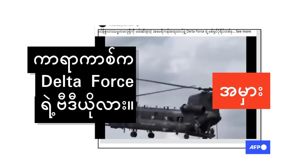"ဗင်နီဇွဲလားသမ္မတမာဒူရိုကို ဖမ်းဆီးခဲ့တဲ့ အမေရိကန်အထူးတပ်ဖွဲ့ Delta Force ရဲ့ မစ်ရှင်ပုံရိပ်တစ်ခု" (မူရင်းအတိုင်း) ဆိုပြီး ၂၀၂၆ ခုနှစ်၊ ဇန်နဝါရီလ ၄ ရက်ကမျှဝေထားတဲ့ Facebook ပို့စ်မှာ ရေးသားထားပါတယ်။
