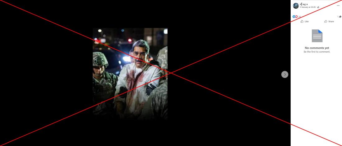 "ဗင်နီဇွဲလားသမ္မတ မာဒူရိုနှင့် ၎င်း၏ ဇနီး သည်ကို အမေရိကန်က ဖမ်းဆီးရမိပြီ ဖြစ်ကြောင်း ဒေါ်နယ်ထရန့်အတည်ပြု၊ ၃/၁/၂၀၂၆။" (မူရင်းအတိုင်း) ဆိုပြီး ၂၀၂၆ ခုနှစ်၊ ဇန်နဝါရီလ ၃ ရက်က မျှဝေထားတဲ့ ဒီ Facebook ပိုစ့်မှာ ရေးသားထားပါတယ်။