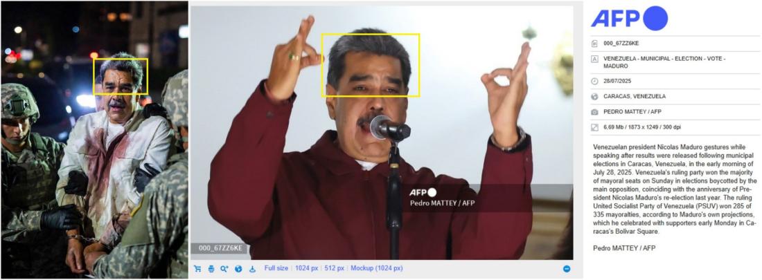၂၀၂၆ ခုနှစ်၊ ဇန်နဝါရီလအတွင်း ဗင်နီဇွဲလားခေါင်းဆောင် နီကိုလပ်စ် မာဒူရိုနဲ့ ဇနီးကို အမေရိကန်တပ်ဖွဲ့တွေက ဖမ်းဆီးခေါ်ဆောင်ခဲ့တဲ့နောက် အဲဒီစစ်ဆင်ရေးနဲ့ ပတ်သက်တဲ့ မှားယွင်းပြောဆိုမှုတွေဟာ လူမှုကွန်ရက်မှာ ပျံ့နှံ့ခဲ့ပါတယ်။ ဒီမှားယွင်းပို့စ်တွေထဲမှာ လက်ထိပ်ခတ်ခံထားရပြီး သွေးစွန်းနေတဲ့ အဖြူရောင်အင်္ကျီဝတ်ဆင်ထားတဲ့ အာဏာဖြုတ်ချခံသမ္မတရဲ့ AI ဖန်တီးမှုရုပ်ပုံတစ်ခုလည်း ပါဝင်ပါတယ်။ ပျံ့နှံ့နေတဲ့ရုပ်ပုံဟာ အမေရိကန်အစိုးရက ထုတ်ဝေတဲ့ ဓာတ်ပုံတွေနဲ့ ကွဲပြားနေတဲ့အပြင် လုပ်ကြံဖန်တီးထားကြောင်း သိသာစေတဲ့ ရုပ်ပုံကွဲလွဲမှုများစွာကိုလည်း စိစစ်တွေ့ရှိရပါတယ်။