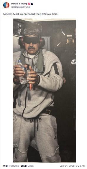 ၂၀၂၆ ခုနှစ်၊ ဇန်နဝါရီ ၄ ရက်မှာ "USS Iwo Jima ပေါ်က" အားကစားဝတ်စုံဝတ်ဆင်ထားပြီး မျက်လုံးတွေကို အမည်းရောင်မျက်မှန်နဲ့ ဖုံးအုပ်ထားတဲ့ ဖြုတ်ချခံသမ္မတရဲ့ ဓာတ်ပုံကို ထရမ့်က Truth Social မှာမျှဝေခဲ့ပေမယ့် သွေးစွန်းနေတာမျိုး တွေ့ရခြင်းမရှိပါဘူး။ (Archived link)