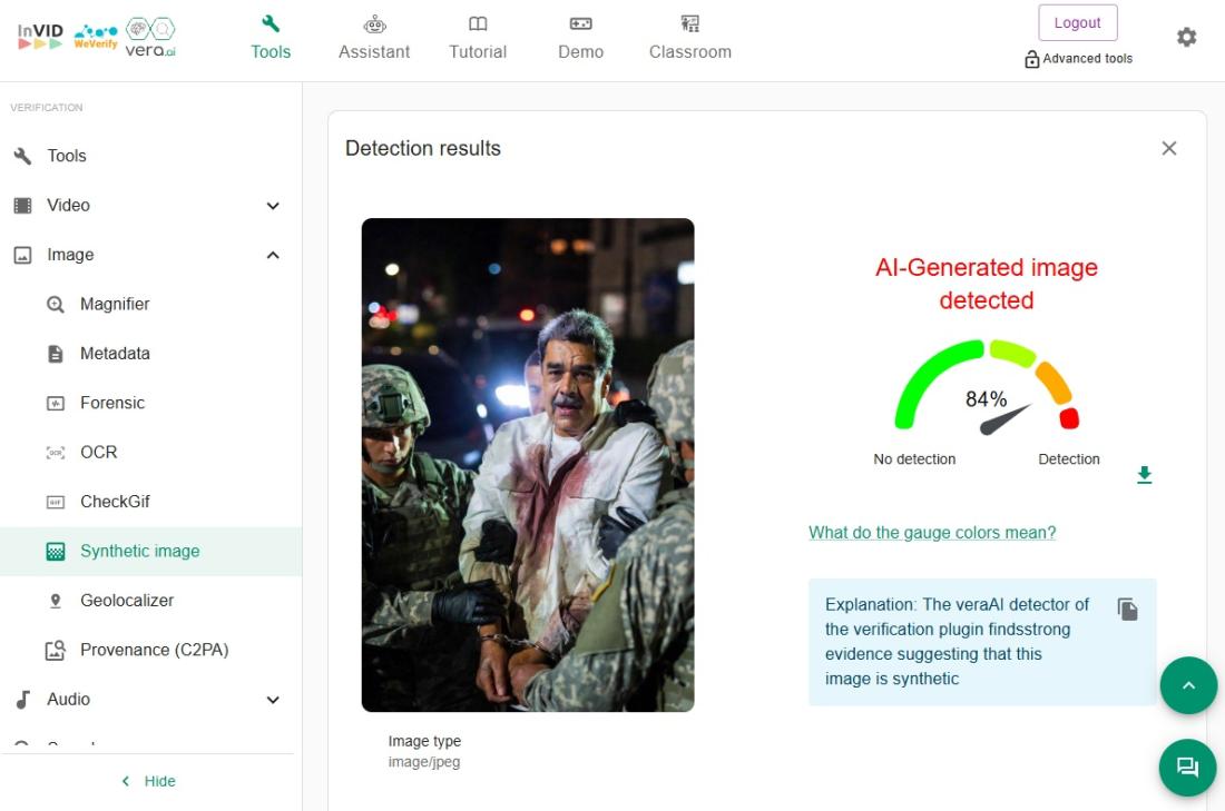 InVID-WeVerify လို့လူသိများတဲ့ The Verification Plugin ကိုအသုံးပြုပြီး စစ်ဆေးကြည့်ရာ လက်ထိပ်ခတ်ခံထားရတဲ့ မာဒူရိုရဲ့ ရုပ်ပုံဟာ AI နဲ့ဖန်တီးထားတယ်ဆိုတာကို တွေ့ခဲ့ရပါတယ်။