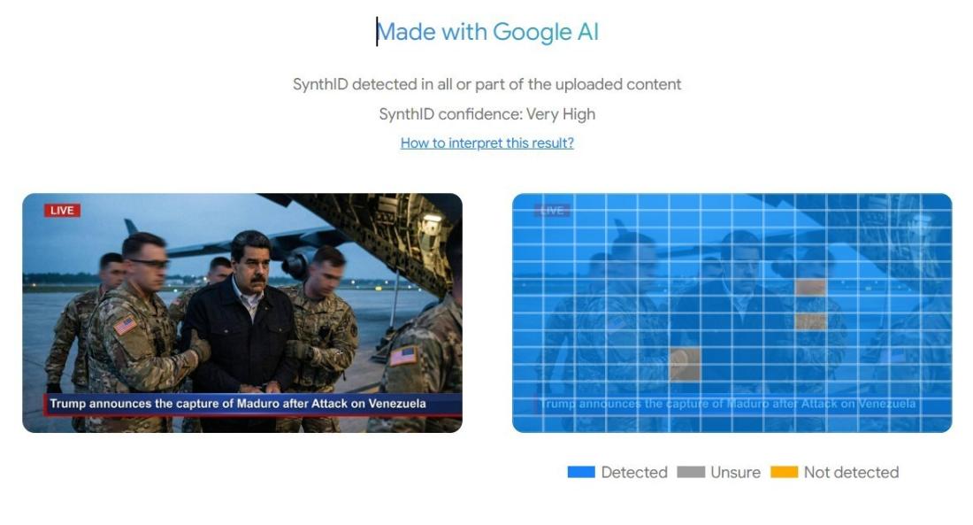 ၂၀၂၆ ခုနှစ်၊ ဇန်နဝါရီလ ၃ ရက် ဗုံးကြဲစီးနင်းတိုက်ခိုက်မှုအတွင်း အမေရိကန်တပ်ဖွဲ့တွေက ဗင်နီဇွဲလားသမ္မတဟောင်း နီကိုလပ်စ် မာဒူရိုနဲ့ ဇနီး ဆီလီယာ ဖလောရက်စ်တို့ကို ဖမ်းဆီးခဲ့ပြီး နယူးယောက်ခ်မှာ မူးယစ်ဆေးဝါးစွဲချက်တွေနဲ့ ရုံးတင်စစ်ဆေးခဲ့ပါတယ်။ ဒါပေမဲ့ သူတို့စုံတွဲ လေယာဉ်ပေါ်ကနေ လုံခြုံရေးတပ်သားတွေနဲ့ ဆင်းသက်လာတာပြတဲ့ ရုပ်ပုံတွေဟာ AI နဲ့ဖန်တီးထားတာပဲဖြစ်ပါတယ်။ Google ရဲ့ AI နည်းပညာနဲ့ဖန်တီးထားတဲ့ပုံတွေဟာ သတင်းတွေမှာဖော်ပြထားတဲ့ မာဒူရို နယူးယောခ်ကိုရောက်ရှိစဥ်က ဓာတ်ပုံတွေနဲ့ ကိုက်ညီမှုမရှိပါဘူး။