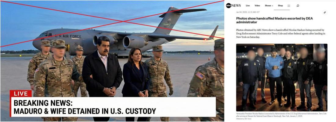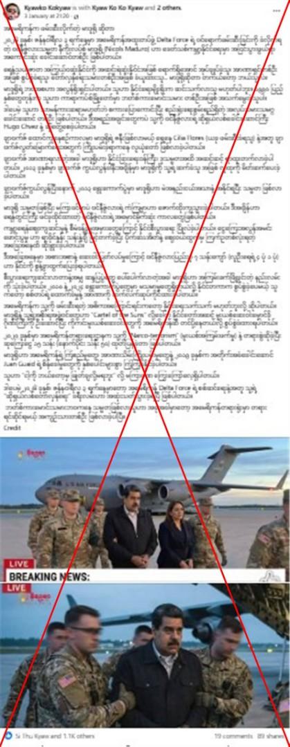 ၂၀၂၆ ခုနှစ်၊ ဇန်နဝါရီလ ၃ ရက်က မျှဝေထားတဲ့ ဒီ Facebook ပိုစ့်ရဲ့ ပထမရုပ်ပုံမှာ လက်ထိပ်ခတ်ခံထားရတဲ့ အာဏာဖြုတ်ချခံသမ္မတနဲ့ ဇနီးကို စစ်သားတွေဝိုင်းရံထားပြီး နောက်ခံမှာ အမေရိကန်လေတပ်က လေယာဥ်တစ်စီးကိုလည်း တွေ့ရပါတယ်။ ဒုတိယပုံမှာတော့ စစ်သားတွေ စောင့်ကြပ်ထားတဲ့ မာဒူရိုကိုတွေ့ရပါတယ်။