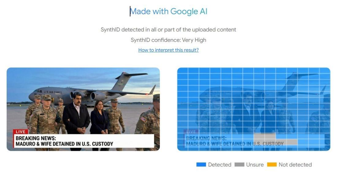 AI နဲ့ဖန်တီးမှု အကြောင်းအရာတွေကို စိစစ်ဖို့ ၂၀၂၅ ခုနှစ်၊ မေလမှာ စတင်မိတ်ဆက်ခဲ့တဲ့ Google ရဲ့ SynthID Detector နဲ့ထပ်မံ စစ်ဆေးကြည့်ရာ ဓာတ်ပုံဟာ AI အသုံးပြုပြီး ဖန်တီးထားနိုင်ချေ "အလွန်မြင့်မား" တယ်လို့အဖြေရရှိပါတယ်။ (Archived link)