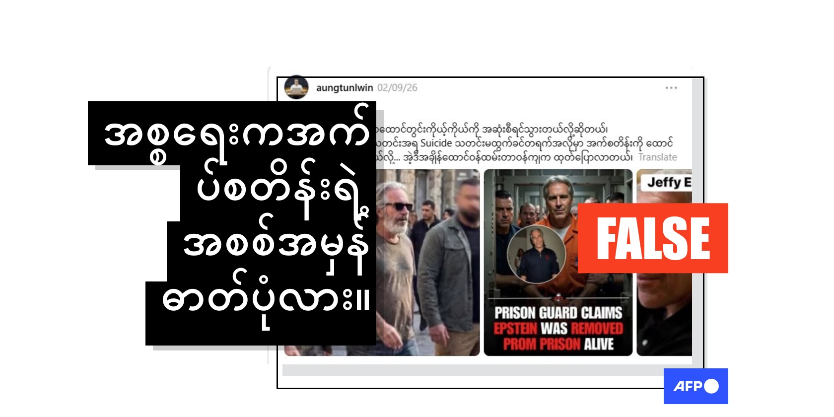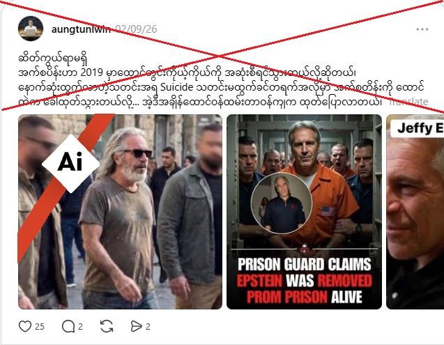 ၂၀၁၉ ခုနှစ်က လိင်ပိုင်းဆိုင်ရာဆွဲချက်တွေနဲ့ တရားရင်ဆိုင်ဖို့ စောင့်ဆိုင်းနေစဥ် အကျဥ်းထောင်တစ်ခုမှာ မိမိကိုယ်ကိုအဆုံးစီရင်ခဲ့တဲ့ လိင်မုဆိုး ဂျက်ဖရီ အက်ပ်စတိန်းနဲ့သက်ဆိုင်တဲ့ အချက်အလက်တွေကို အမေရိကန် တရားရေးဌာနက ထုတ်ဝေခဲ့တဲ့နောက် သူ့ကို အစ္စရေးနိုင်ငံမှာ အသက်ရှင်လျက်တွေ့ရှိခဲ့တယ်ဆိုပြီး မုတ်ဆိတ်မွေး၊ ဆံပင်ရှည်နဲ့ အက်ပ်စတိန်းရဲ့ ရုပ်ပုံတွေကို မှားယွင်းမျှဝေနေကြပါတယ်။ ဒါပေမဲ့ ဒါဟာ AI အချက်အလက်တွေကို မျှဝေလေ့ရှိတဲ့ Reddit ချန်နယ်တစ်ခုက မူလဖော်ပြထားပြီး မူရင်းရုပ်ပုံမှာလည်း Google Gemini ရဲ့ ရေစာအမှတ်အသားပါရှိပါတယ်။ ဒါအပြင် ဒီရုပ်ပုံတွေမှာ AI နဲ့ ဖန်တီးထားကြောင်း သိသာစေတဲ့ သဲလွန်စတွေပါရှိပါတယ်။