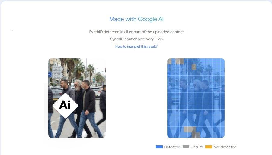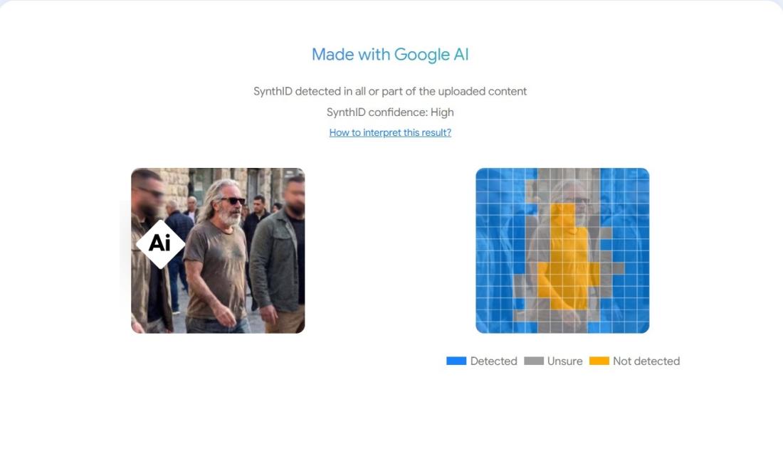 ထပ်မံပြီး Google AI နဲ့ ဖန်တီးချက်တွေကို စစ်ဆေးပေးတဲ့ SynthID ရဲ့ ဆန်းစစ်မှုအရ ဒီရုပ်ပုံကို AI နဲ့ ပြုလုပ်ဖန်တီးမှုဖြစ်နိုင်ခြေ "အလွန်မြင့်မား" ကြောင်း တွေ့ရပါတယ်။