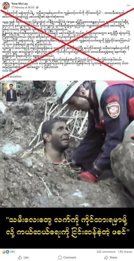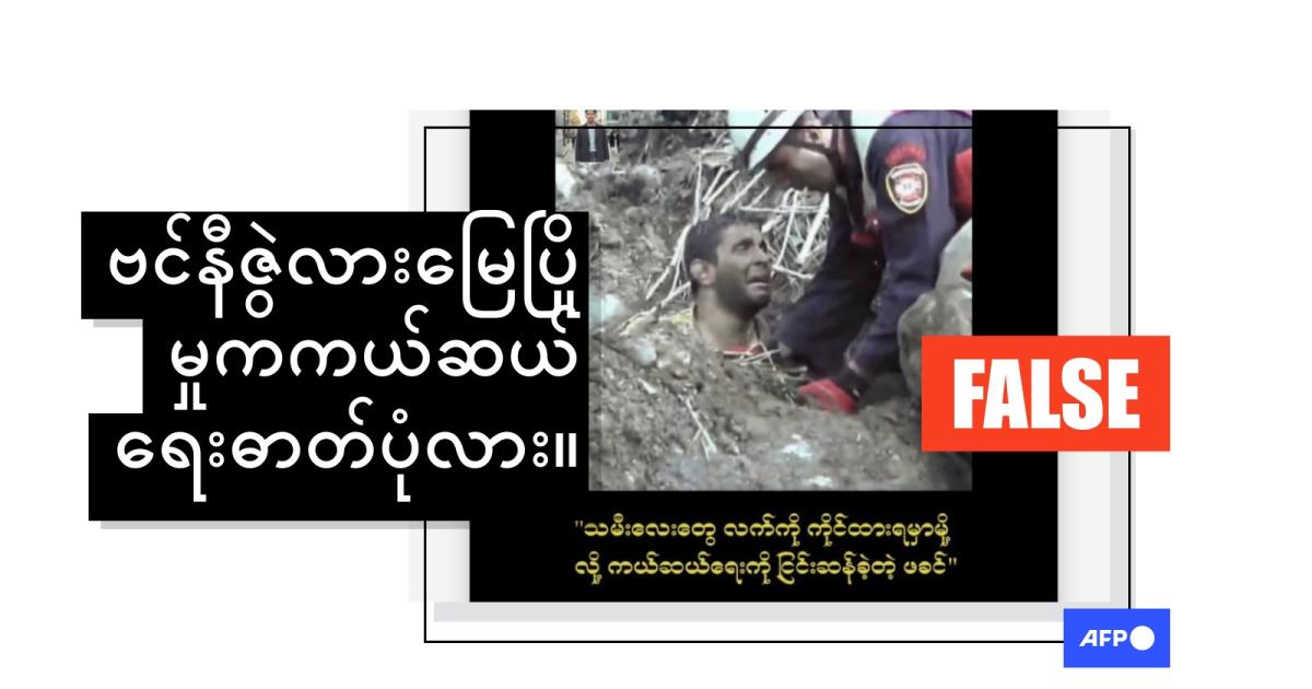 လည်ပင်းနဲ့ ဦးခေါင်းသာမြင်ရပြီး မြေကြီးထဲမှာ ပိတ်မိနေတဲ့လူတစ်ယောက်ကို ကယ်ဆယ်ရေးလုပ်သားတစ်ဦးက ကူညီဖို့ ကြိုးစားနေတဲ့ ဓာတ်ပုံတစ်ပုံကို အဲဒီပိုစ့်မှာ ဖော်ပြထားပါတယ်။