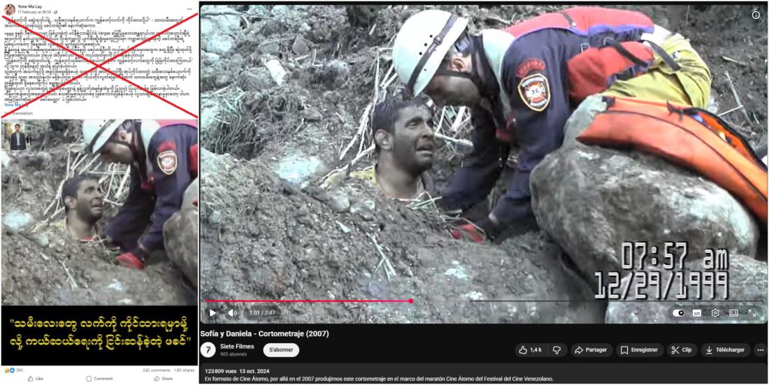 ရုပ်ရှင်ဇာတ်လမ်းတိုတစ်ခုကရယူထားတဲ့ Screenshot ကို လွန်ခဲ့တဲ့နှစ်ပေါင်း နှစ်ဆယ်ကျော်က ဗင်နီဇွဲလားနိုင်ငံမှာ ဖြစ်ပွားခဲ့တဲ့ မြေပြိုမှုအတွင်း သမီးတွေရဲ့လက်ကိုကိုင်ထားရမှာမို့ ကယ်ဆယ်ရေးတွေကိုငြင်းဆန်နေတဲ့ ဖခင်တစ်ဦးဆိုပြီး လူမှုကွန်ရက်မှာ မှားယွင်းမျှဝေနေကြပါတယ်။ ဇာတ်လမ်းတိုရဲ့ အပိုင်းတစ်ခုကို ဗင်နီဇွဲလားရုပ်ရှင်ပွဲတော်အတွက် ရိုက်ကူးထားကြောင်း ဖော်ပြချက်နဲ့ YouTube မှာမျှဝေထားပါတယ်။ ဒါအပြင် ရုပ်ရှင်ထုတ်လုပ်သူကလည်း အဲဒီ ဇာတ်လမ်းဟာ သဘာဝဘေးအန္တရာယ်ဖြစ်ပွားစဥ်က ရိုက်ကူးထားတာမဟုတ်ဘူးဆိုပြီး သီးခြားဗီဒီယိုတစ်ခုမှာ ပြောဆိုထားပါတယ်။