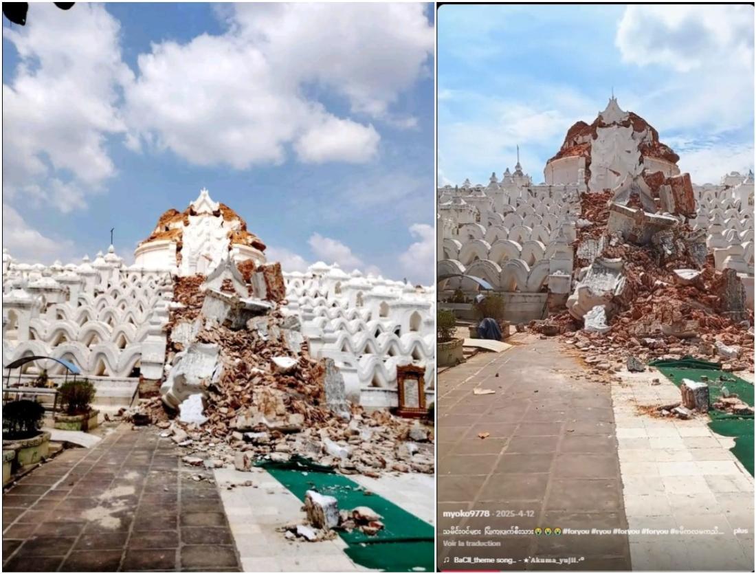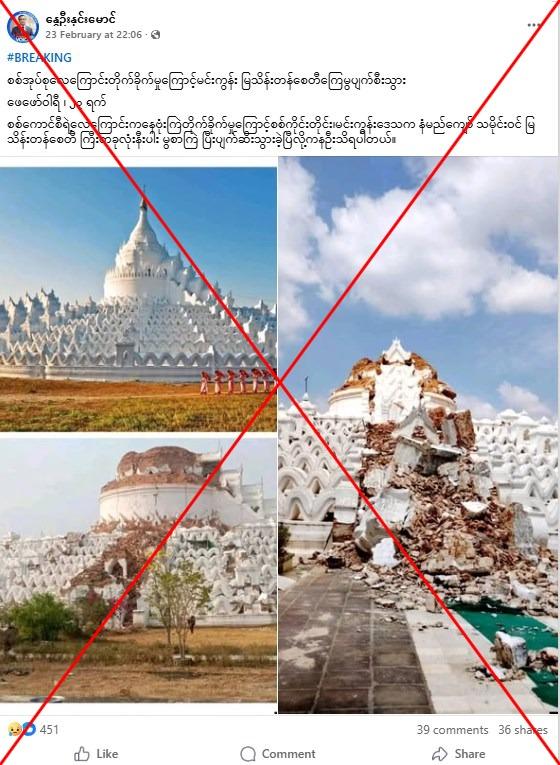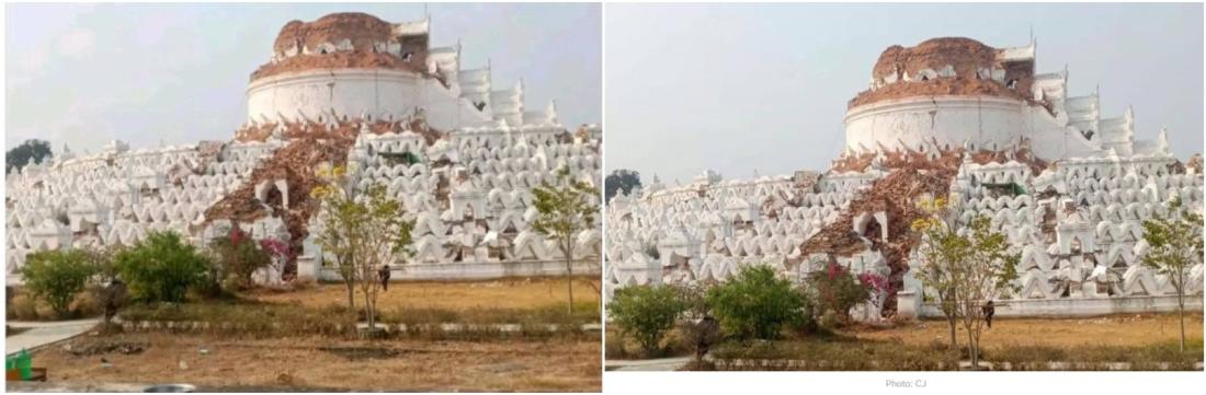 ငလျင်ကြောင့်ပျက်စီးခဲ့တဲ့ မြသိန်းတန်စေတီဓာတ်ပုံတွေကို စစ်တပ်ဗုံးကြဲမှုဆိုပြီး မှားယွင်းမျှဝေ