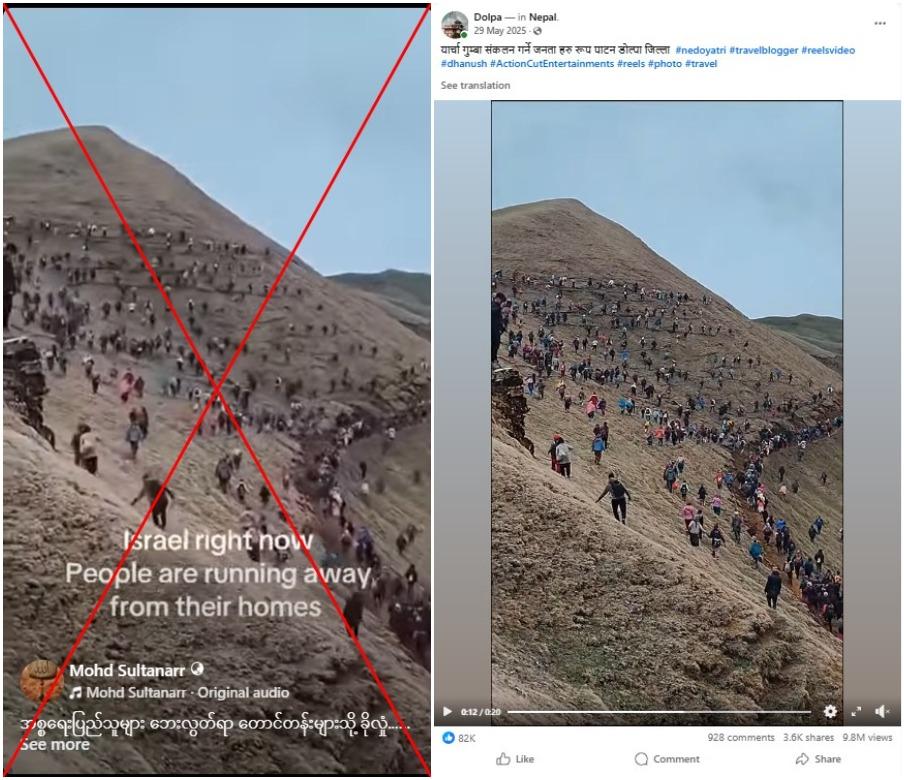 ဖေဖော်ဝါရီလက အမေရိကန်နဲ့ အစ္စရေးရဲ့ ပူးတွဲတိုက်ခိုက်မှုမှာ အီရန်ထိပ်သီးခေါင်းဆောင် သေဆုံးခဲ့ပြီး အစ္စလာမစ်သမ္မတနိုင်ငံရဲ့ တုံ့ပြန်ဒုံးကျည်ပစ်ခတ်မှုတွေကြောင့် အစ္စရေးမှာ အနည်းဆုံး လူတစ်ဒါဇင်ခန့် သေဆုံးခဲ့ပါတယ်။ ဒါပေမဲ့ လူမှုကွန်ရက်မှာ မျှဝေနေကြတဲ့တောင်စောင်းတစ်ခုပေါ်ပြေးလွှားနေတဲ့ လူအုပ်ကြီးရဲ့ ဗီဒီယိုဟာ လက်ရှိဒေသတွင်းစစ်ပွဲကထွက်ပြေးနေကြတဲ့ အစ္စရေးလူမျိုးတွေမဟုတ်ပါဘူး။ ဒါဟာ ၂၀၂၅ ခုနှစ်၊ မေလမှာရိုက်ကူးထားတဲ့ နှစ်စဥ် ဟိမဝန္တာတောင်တန်းပေါ်က ရှီးပတီးရှာဖွေမှု ဖြစ်ပါတယ်။
