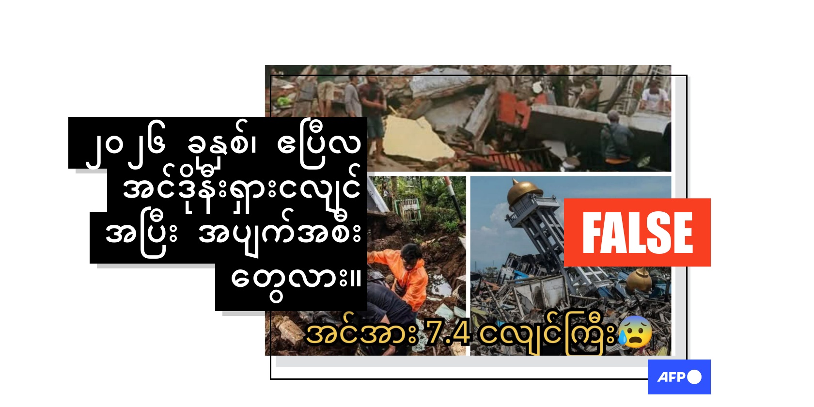 ၂၀၂၆ ခုနှစ်၊ ဧပြီလအစောပိုင်းက အင်ဒိုနီးရှားနိုင်ငံအရှေ့ပိုင်းမှာ ပြင်းအား ၇.၄ မဂ္ဂနီကျုရှိ အင်အားပြင်း ငလျင်တစ်ခုလှုပ်ခတ်ခဲ့ပါတယ်။ ဒါပေမဲ့ လူမှုကွန်ရက်မှာပျံ့နှံ့နေတဲ့ ပြိုကျနေတဲ့အဆောက်အအုံဓာတ်ပုံတွေကတော့ ကျွန်းစုမှာ ယခင်ဖြစ်ပေါ်ခဲ့တဲ့ ငလျင်တွေကပဲဖြစ်ပါတယ်။ အဲဒီဓာတ်ပုံတွေကို ထင်ရှားတဲ့သတင်းအေဂျင်စီတွေက ၂၀၁၈၊ ၂၀၂၁ နဲ့ ၂၀၂၂ ခုနှစ်တွေမှာ ထုတ်ဝေခဲ့ပါတယ်။