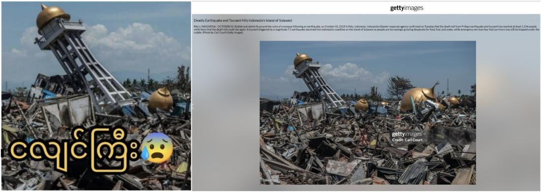 မှားယွင်းပိုစ့်မှာ မျှဝေထားတဲ့ တတိယမြောက်ဓာတ်ပုံကိုတော့ ဓာတ်ပုံရောင်းဝယ်ရေးဝဘ်ဆိုဒ်တစ်ခုဖြစ်တဲ့ Getty Images က ၂၀၁၈ ခုနှစ်၊ အောက်တိုဘာလ ၂ ရက်မှာ မျှဝေထားပါတယ်။ အင်ဒိုနီးရှားနိုင်ငံအလယ်ပိုင်း ဆူလာဝေစီပြည်နယ် Palu မှာ ပြင်းအား ၇.၅ မဂ္ဂနီကျုအဆင့်ရှိငလျင်တစ်ခုလှုပ်ခတ်ပြီးနောက် ဗလီတစ်ခုအနီးက အပျက်အစီးတွေနဲ့ အုတ်ပုံအပိုင်းအစတွေဆိုပြီး ဖော်ပြထားပါတယ်။ (Archived link)