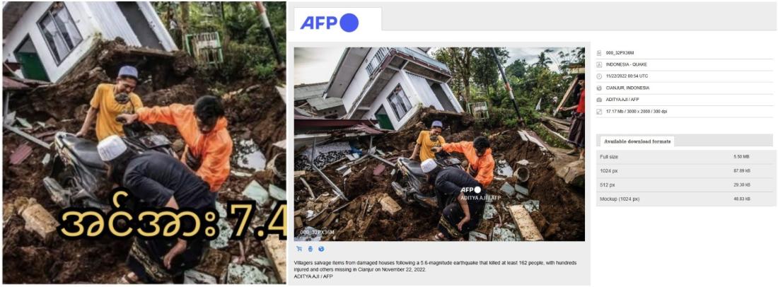 ထပ်မံရှာဖွေမှုတွေအရ မှားယွင်းပိုစ့်က ဒုတိယဓာတ်ပုံဟာ ၂၀၂၂ ခုနှစ်၊ နိုဝင်ဘာလ ၂၂ ရက်မှာ AFP ကဖော်ပြခဲ့တဲ့ အင်ဒိုနီးရှားနိုင်ငံ၊ အနောက်ဂျာဗားရှိ Cianjur မြို့မှာလှုပ်ခတ်ခဲ့တဲ့ ငလျင်ရဲ့ သတင်းဓာတ်ပုံပဲဖြစ်ပါတယ်။