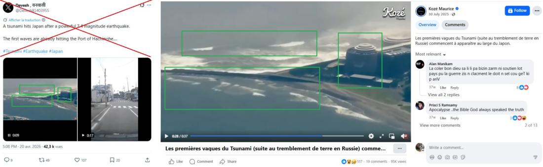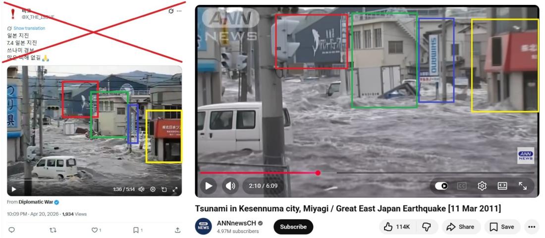 ၂၀၂၆ ခုနှစ်၊ ဧပြီလ ၂၀ ရက်မှာ ဂျပန်နိုင်ငံ အရှေ့တောင်ပိုင်း ကမ်းရိုးတန်းကို ပြင်းအား ၇.၇ မဂ္ဂနီကျု ငလျင်လှုပ်ခတ်ခဲ့တဲ့နောက် ဒီငလျင်ရဲ့ရိုက်ခတ်မှုဆိုပြီး ဗီဒီယိုအများအပြား လူမှုကွန်ရက်မှာ ပျံ့နှံ့ခဲ့ပါတယ်။ ဒါပေမဲ့ ဒီဗီဒီယိုတွေဟာ ၂၀၂၅ ခုနှစ်မှာ ဂျပန်နိုင်ငံကို ဆူနာမီရေလှိုင်းရိုက်ခတ်မှု၊ ၂၀၂၄ ခုနှစ် နှစ်သစ်ကူးနေ့ ငလျင်လှုပ်ခတ်မှုနဲ့ ၂၀၁၁ ခုနှစ် မတ်လက ငလျင်လှုပ်ခတ်မှုနဲ့ ဆူနာမီရိုက်ခတ်မှုတွေကဖြစ်ပါတယ်။