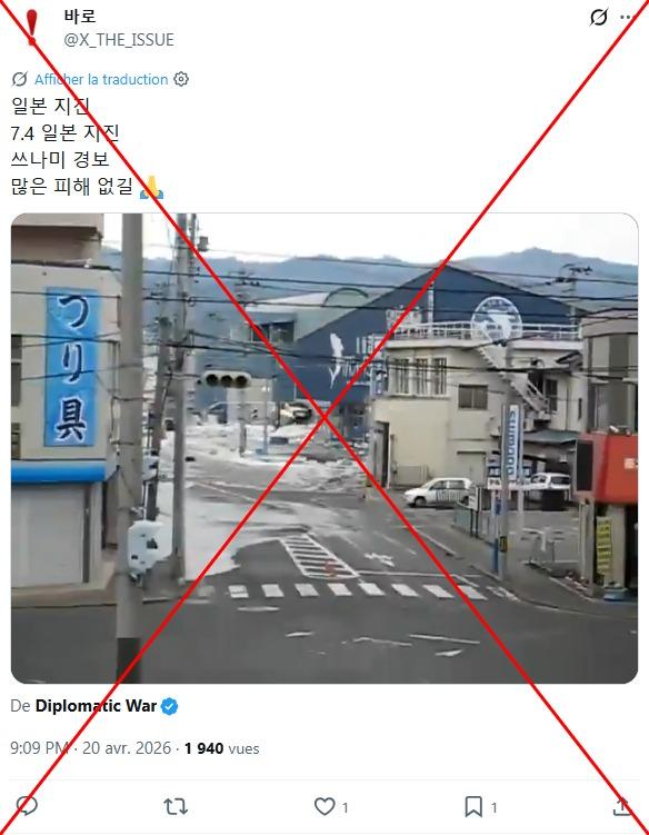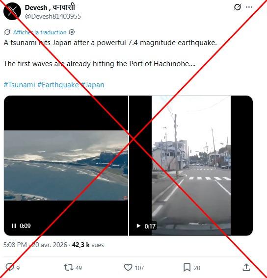 "ပြင်းအား ၇.၄ မဂ္ဂနီကျုရှိ ငလျင်တစ်ခုလှုပ်ခတ်ပြီးနောက် ဂျပန်နိုင်ငံတွင် ဆူနာမီရိုက်ခတ်" ဆိုပြီး ဗီဒီယိုနှစ်ခုကို မျှဝေထားတဲ့ X ပို့စ်မှာ ၂၀၂၆ ခုနှစ်၊ ဧပြီလ ၂၀ ရက်က မျှဝေထားပါတယ်။